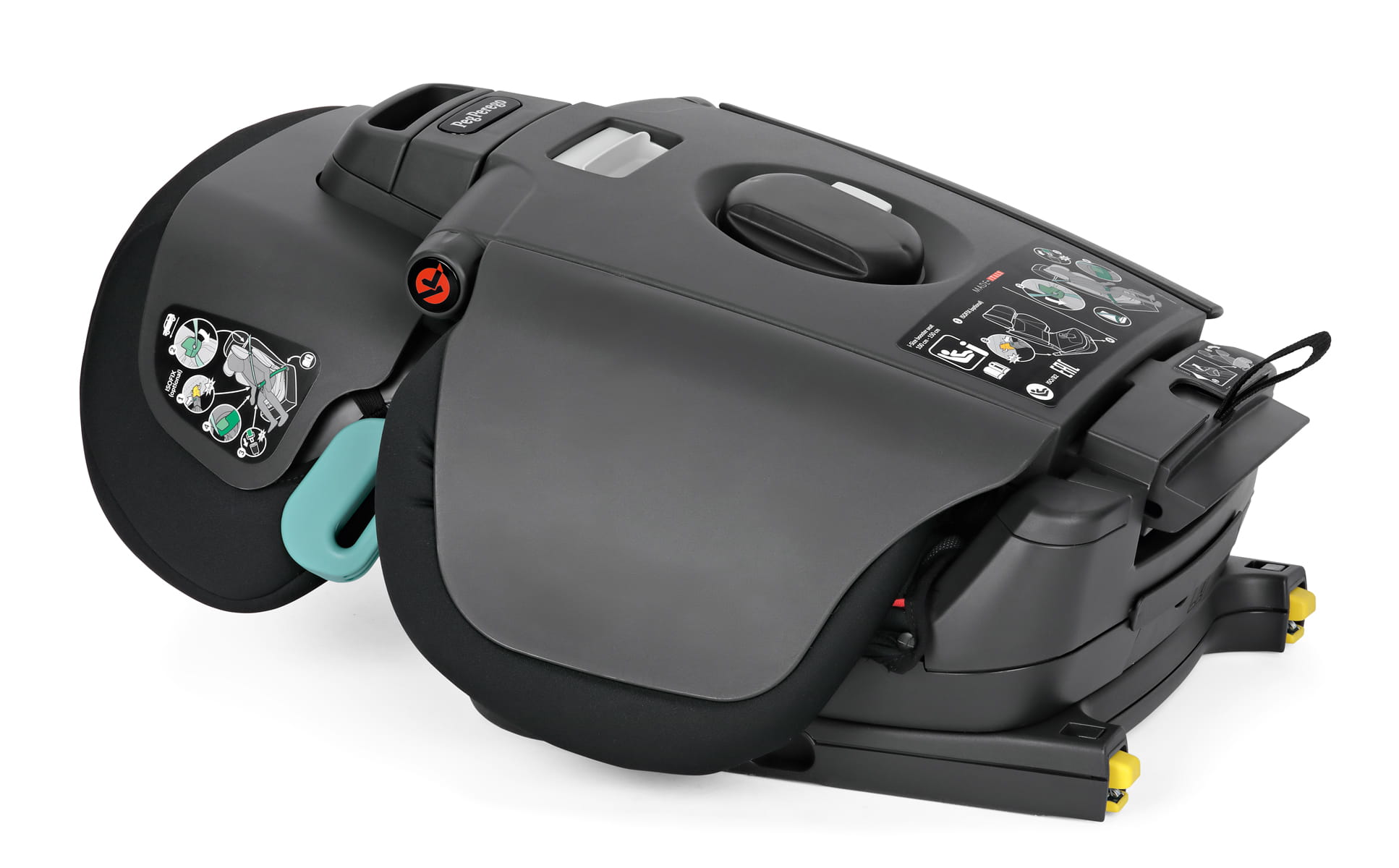 Gdy fotelik jest niepotrzebny, można go złożyć w praktyczną, kompaktową formę przypominającą „walizkę” z uchwytem, co ułatwia przechowywanie i chroni tapicerkę przed zabrudzeniem.