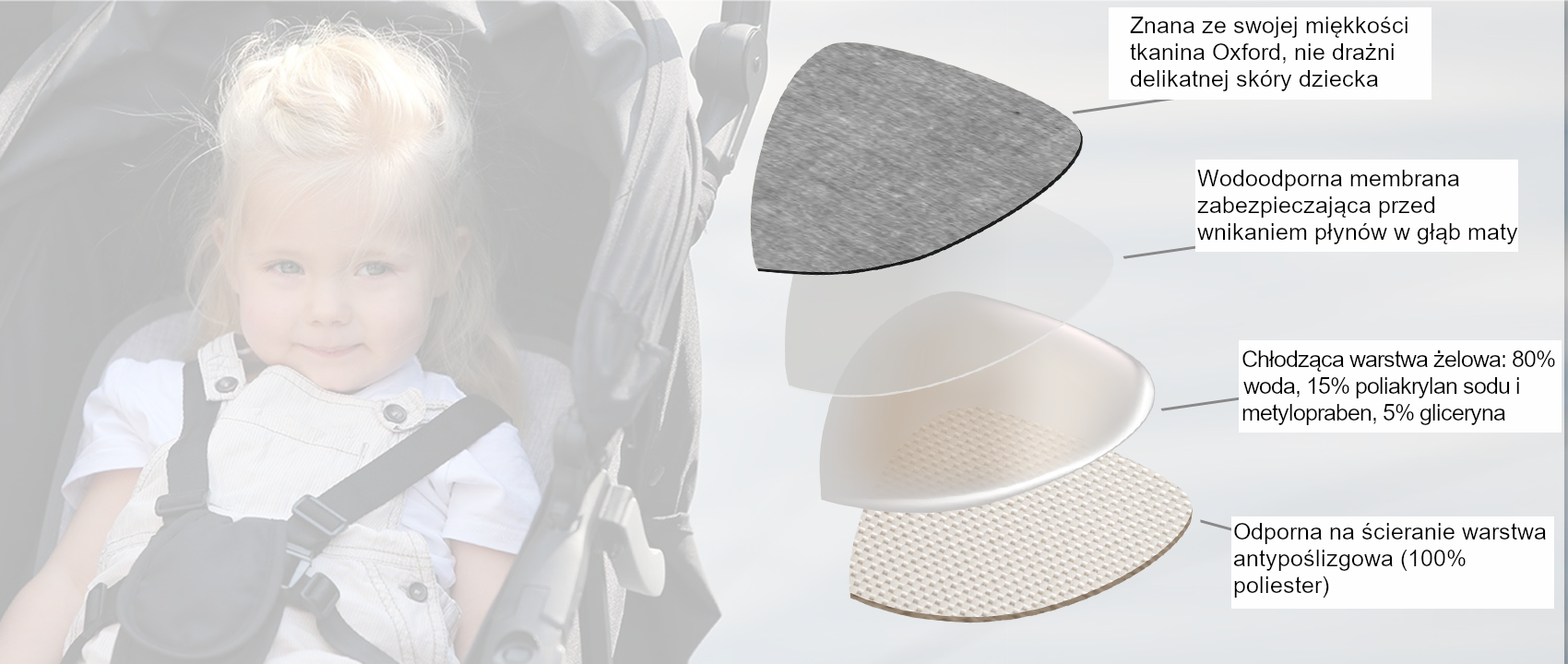 Antypotowa mata chłodząca od BébéFolie może znaleźć zastosowanie do wózków głębokich i spacerowych, fotelików oraz przyczepek rowerowych, chust i nosidełek. Jak działa mata BébéFolie? Sukces maty opiera się na wypełniającym ją specjalnym żelu, który aktywuje się pod wpływem ciepła ciała dziecka i zapewnia mu przyjemne uczucie chłodu. Mata reguluje i utrzymuje temperaturę dziecka we właściwym i przyjemnym poziomie podczas spacerów w upalne dni lub jazdy samochodem. Chłodzenie działa nieprzerwanie nawet podczas bardzo dużych upałów. Nie wymaga ładowania, zasilania ani baterii.