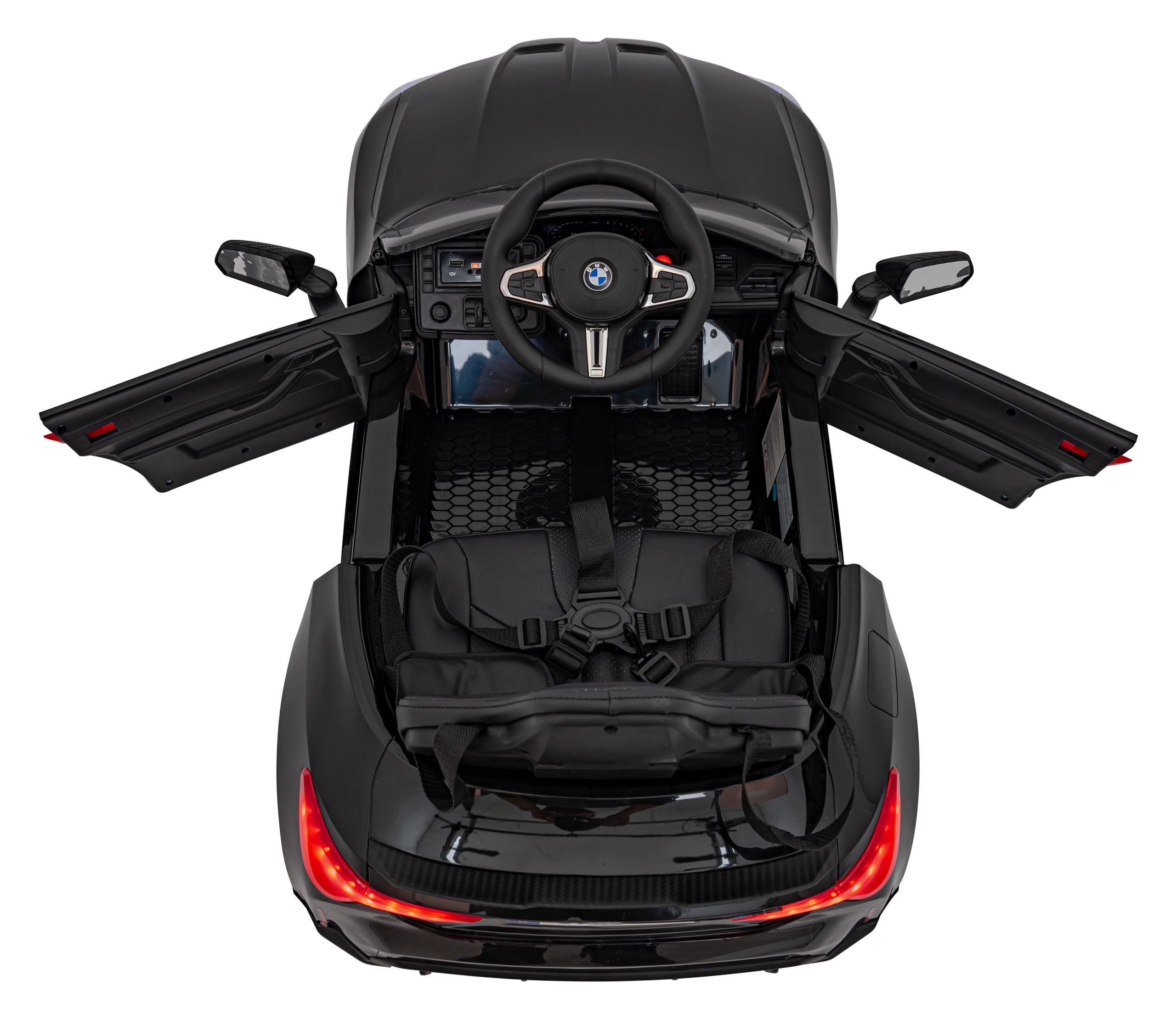 BMW M4 Czarny ma otwierane drzwi oraz podświetlany włącznik, co dodaje pojazdowi bardziej realistycznego charakteru.