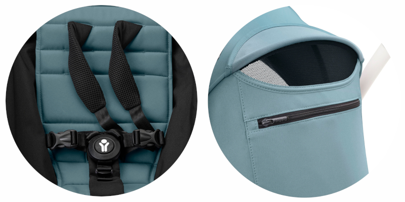 W wózku użyto wodoodpornej tkaniny Anti-UV z wbudowanym filtrem UPF50+. Dzięki temu wózek mniej się nagrzewa, wolniej blaknie oraz chroni malucha przed szkodliwym promieniowaniem. Rączka wózka została wykończona elegancką i przyjemną w dotyku eko-skórą. Dla odpowiedniej ochrony przed słońcem budkę YOYO³ wydłużono także o dodatkowy, rozkładany panel.